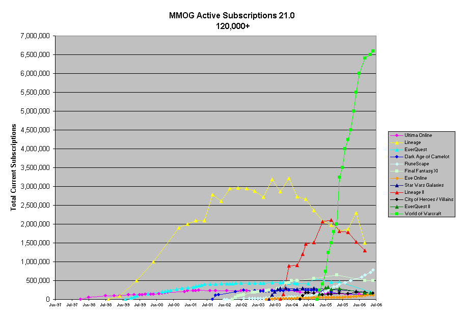 ・・・あーなんだこりゃーってかんじです。 したのほーに、わたしがこれまで住んでいた世界(Ultima Online) がいます。 そ、そして、ものすごいいきおいでのびてる緑色のラインがあります。 こりゃなんじゃ!? んーと、えーと、わ、わーるどおぶ、うぉーくらふと?(ってよむのかな?? なんかよくわかんないけどとんでもない人数のおきゃくさんたちがあつまりまくってます。
